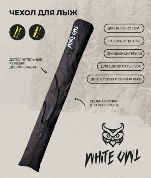 Чехол для горных или беговых лыж White Owl для хранения и переноски инвентаря. Изготовлен из качественного водоотталкивающего материала, который защитит ваши лыжи от намокания, пыли и грязи. Прочная ткань чехла практична в стирке и чистке. Вмещает только одну пару лыж. Длина 160-210 см. Цвет: чёрный.